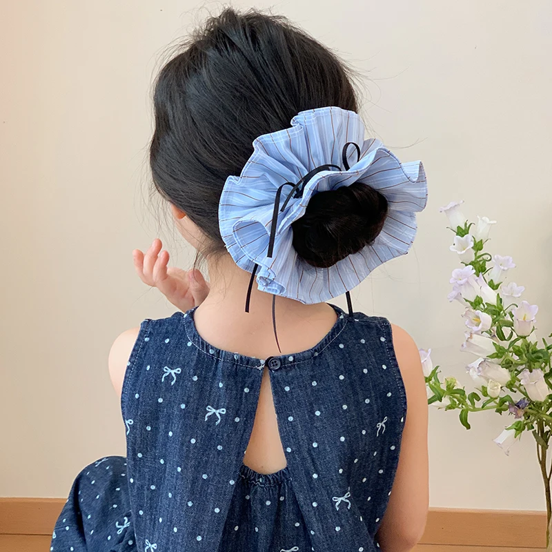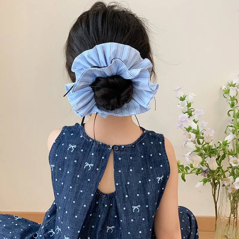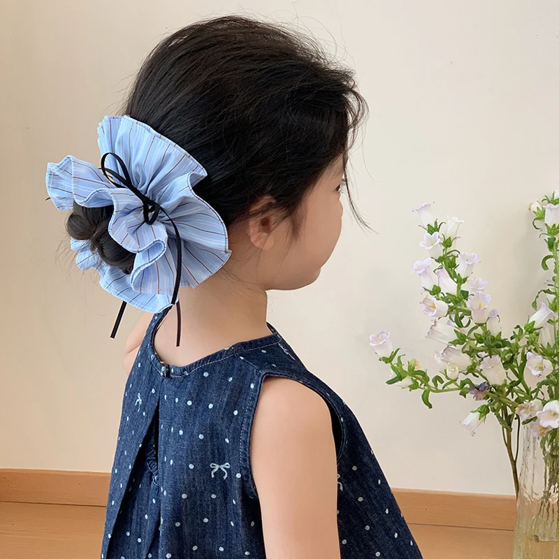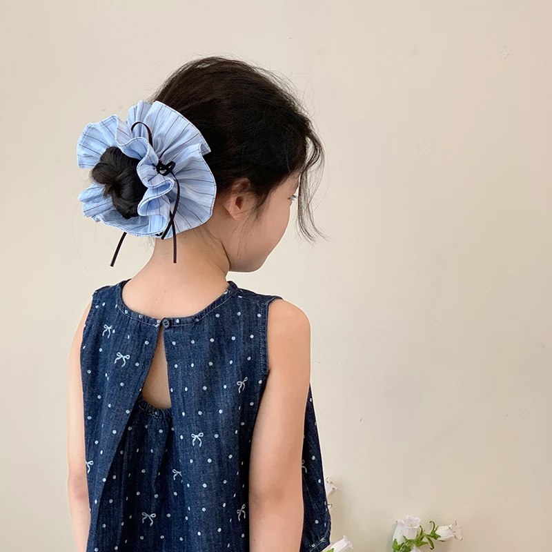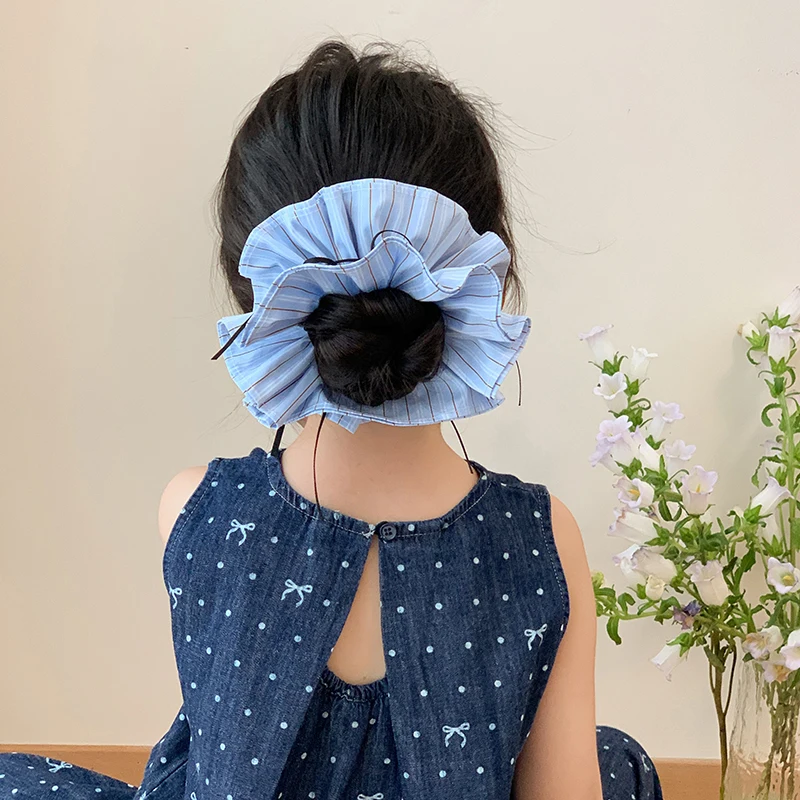 Kids Blue Plaid Ribbon Double Layer Large Scrunchies Fashion Chic Wholesale in Stock Hair Ties Accessories for Children Daily